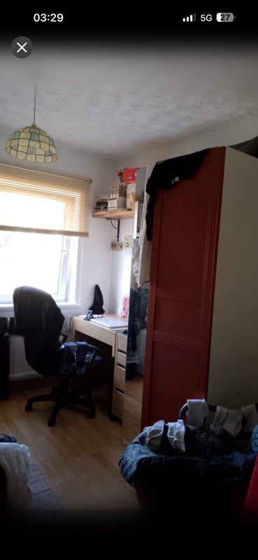 Has a bed, wardrobe, desk and office chair.