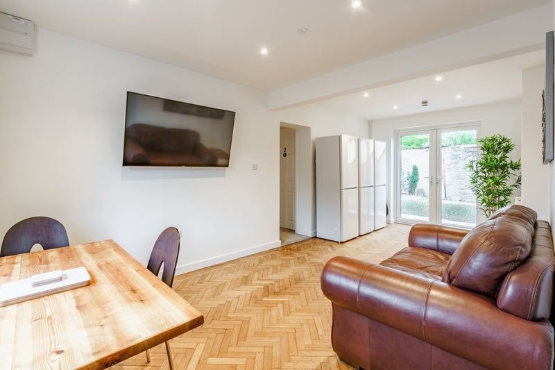 There is a leather sofa and dining table with chairs in the lounge/diner.