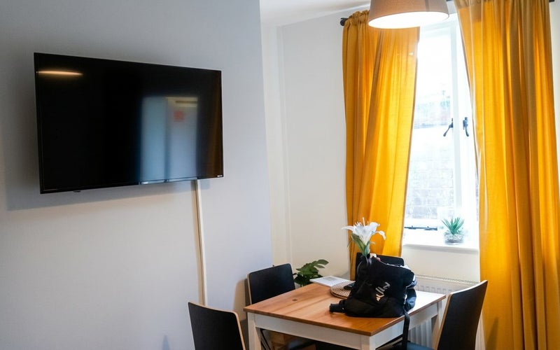 Shared lounge with modern furnishings & wall-mounted TV