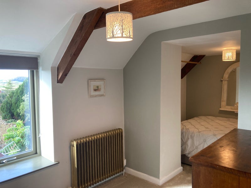 Situated next door to a large bathroom with bath and shower.