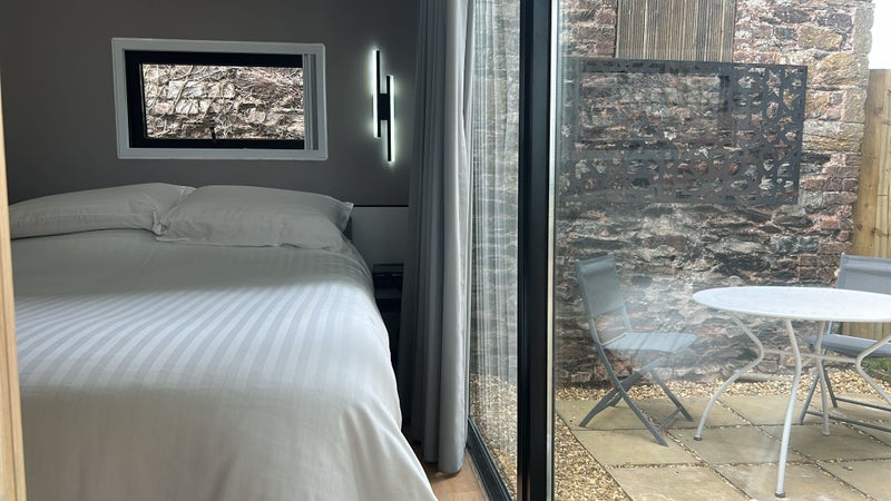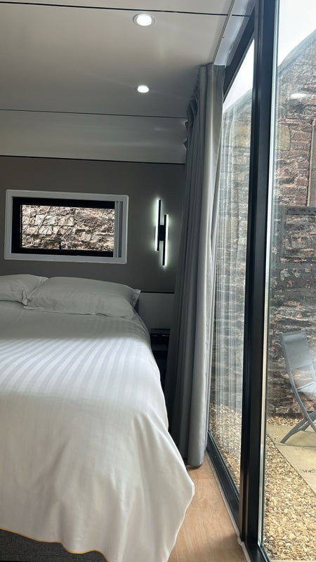 Self contained Pod, double bed, wet room and kitchen area with table and chairs and wardrobe.