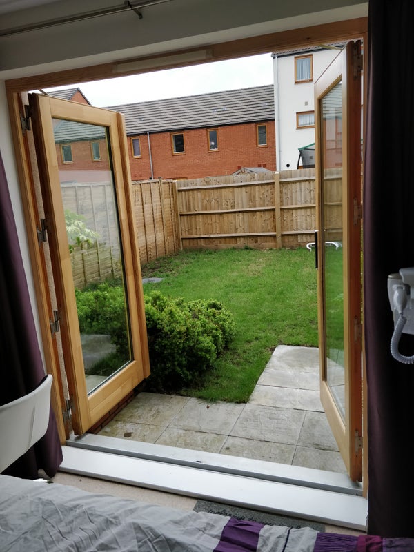 The room is on the ground floor with openable double doors into the garden. The room has a double bed with under-bed storage, a very large wardrobe, a desk, a desk chair, and a Sony 50-inch 4K TV hanging on the wall.