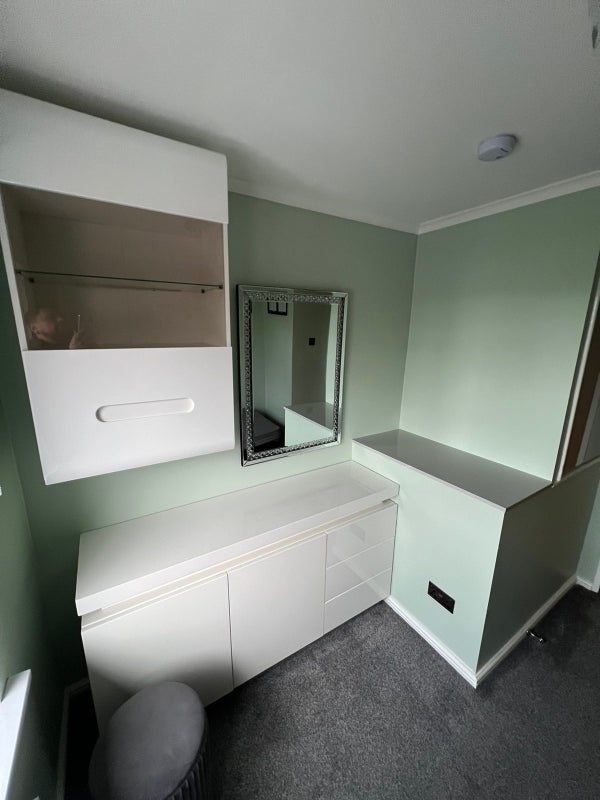 The Single room which comes available soonest on the 29th of November is in TA2 post code area. Will be newly renovated, fully furnished for the date, contains a single lift up bed, an intergrated wardrobe, a large chest of drawers/sideboard, a wall hung matching unit , a puff and a mirror.