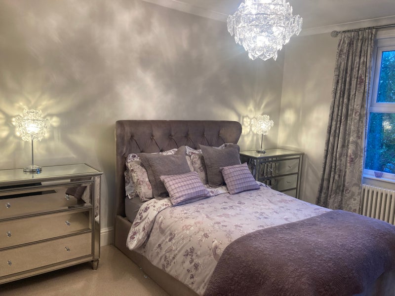 Room: Double room consisting of a double bed, triple mirrored wardrobe and two sets of drawers. There is a TV with Netflix, amazon prime and Disney channels.