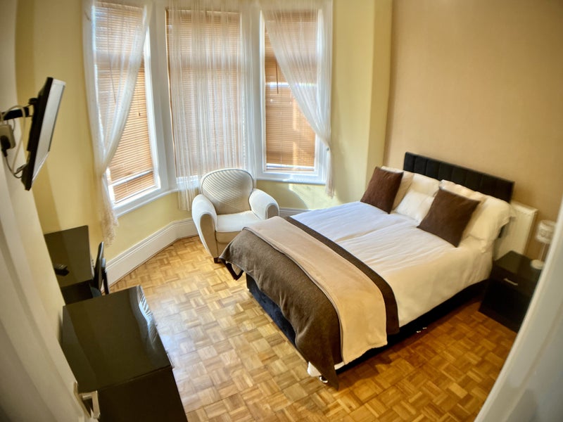 Flooded with daylight, by large bay windows. Light and privacy controlled with venetian/slat blinds, choose the ambient light you prefer. Restored original Victorian parquet flooring, high ceilings with cornice, newish stylish sprang & memory foam bed, headboard, triple wardrobe and a range of matching bedroom furniture, including a desk/dressing table and more. There is also an armchair, for your comfit, and TV if required. The modern furnishings give it an up-to-date feel, yet the room still exudes some of the Victoriana about it.