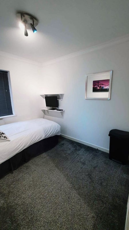 The bedroom advertised is a comfortable size for 1 occupant. The room is fully furnished with a single bed and a TV so the bedroom can give a good night's sleep & entertainment if someone wants to move in right away. Built in wardrobe/storage space and a chest of draws.