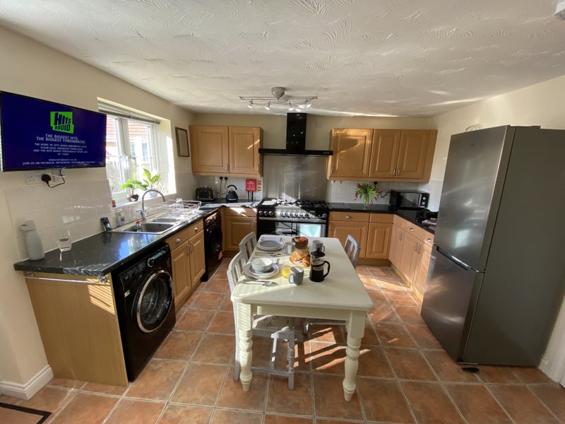 👨🏾🍳Kitchen/Living room equipped with large range cooker, microwave, 2 x fridge freezers, 2 x washer/dryers, sofa and freeview TV.