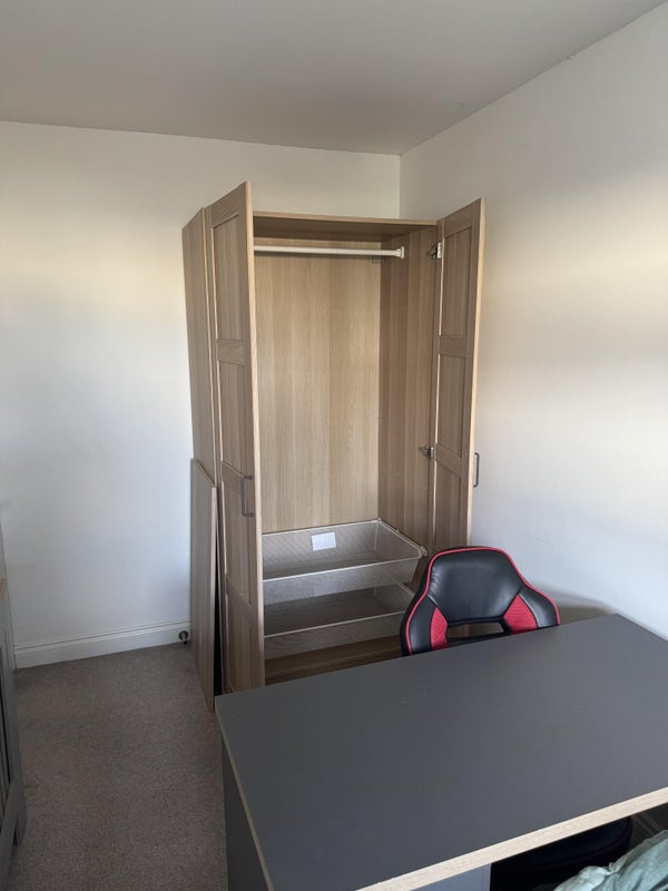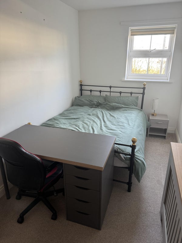 Double bed, wardrobe, bedside table and desk in bedroom.