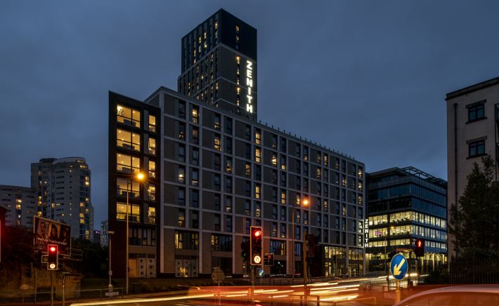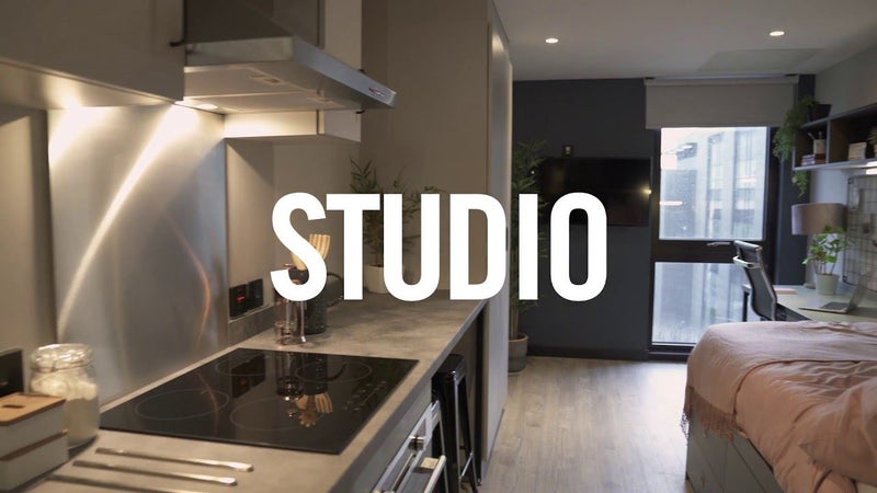A well-presented Standard Studio Apartment – situated at Zenith Cardiff, Herbert Street, Cardiff, CF10 4DG – featuring a spacious kitchen area and amenities including: