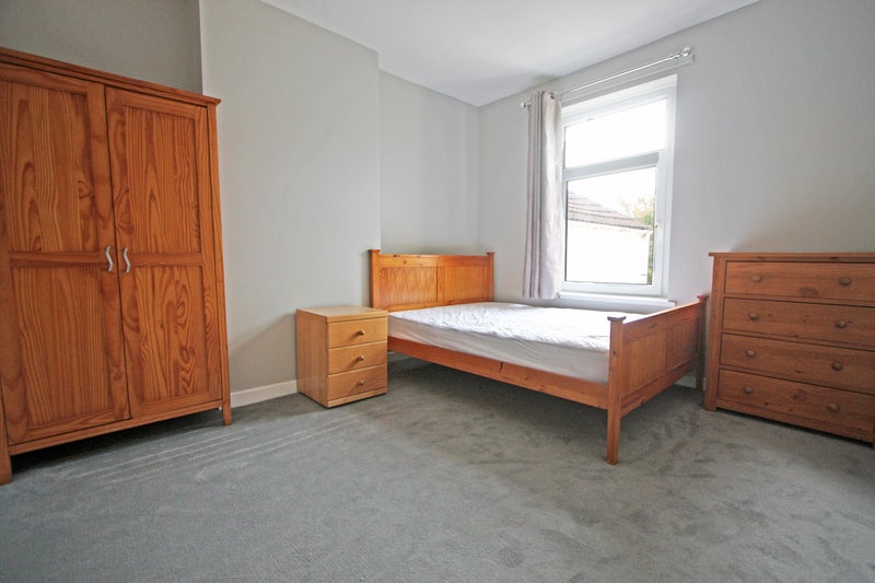 A double bedroom on the first floor with double bed, wardrobe and drawers, and space for desk.