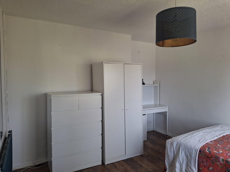The room is on the ground floor, double sized, with a large, south facing window. Although the room is of good size, the kitchen, bathroom, and lounge are small. There is a double bed with new mattress, chest of drawers, small wardrobe and desk.