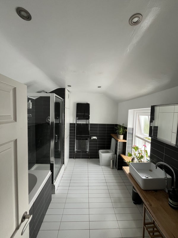 There is an upstairs bathroom with a large bath, shower and toilet.