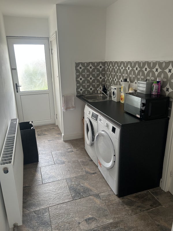* Shared utility room with washing machine, tumble dryer & worktop with sink