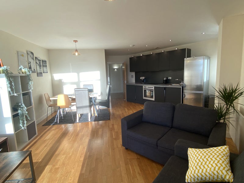 Situated on the sixth floor, this apartment offers more space than many comparable two-bedroom city-centre flats, with a bright and comfortable open-plan kitchen, dining and reception area enhanced by floor-to-ceiling windows and excellent natural light.