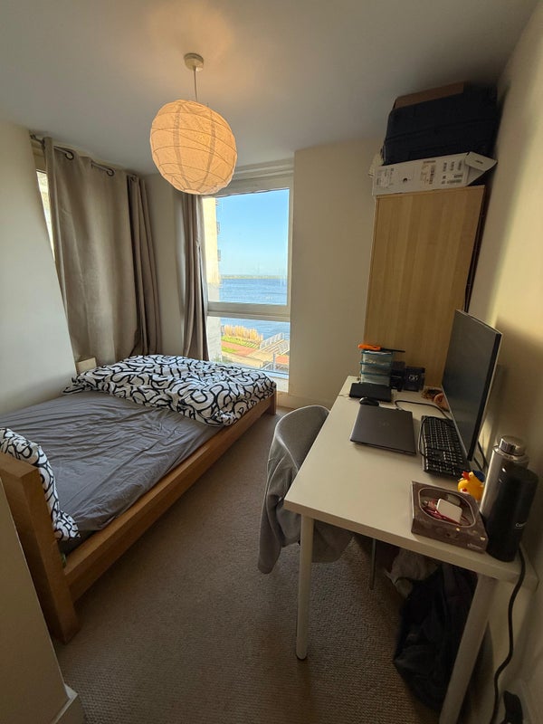 A spacious single room with private washroom is available in a stylish 2-bed furnished apartment on the 3rd floor (with lift access), offering stunning views over Cardiff Bay.