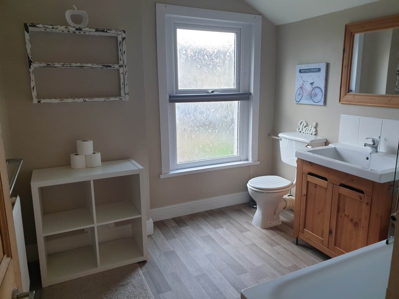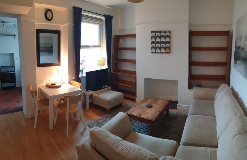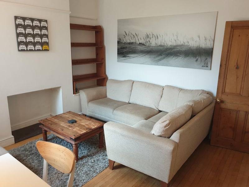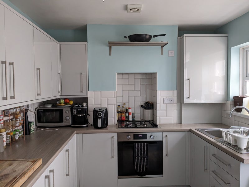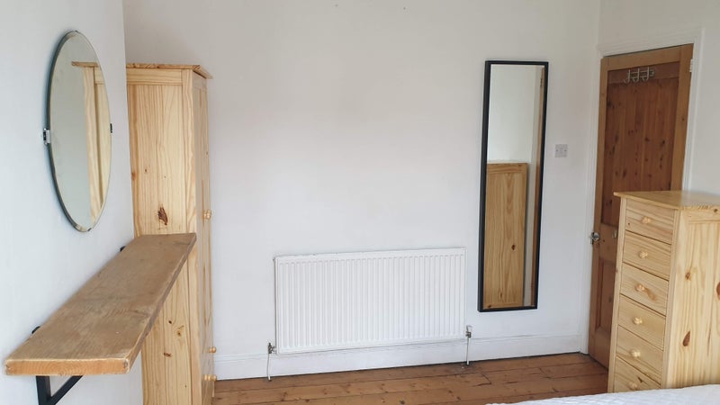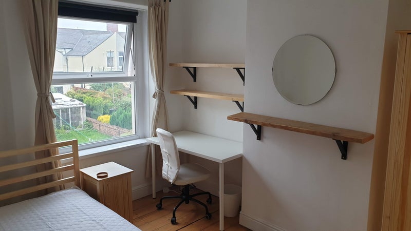 The available room is upstairs, at the back of the house and contains a double bed, a desk with chair, wardrobe and drawers. The kitchen and living room area are shared and there is an outside space.