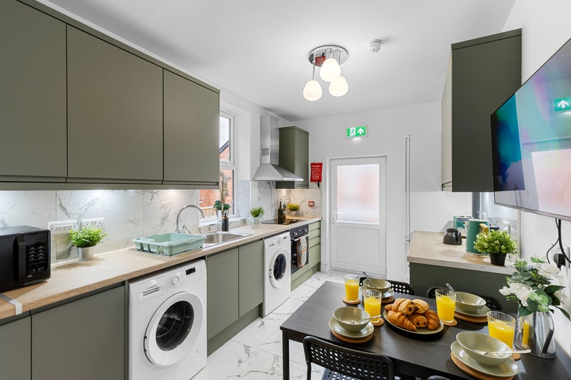 A fully equipped kitchen, including a TV, TWO washing machines and a tumble dryer.