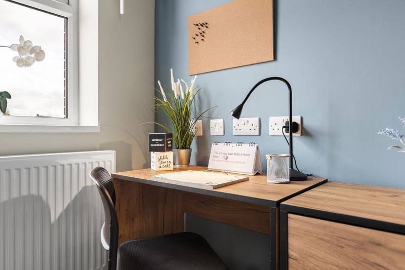 ✅ a DESK with a lamp, a CHAIR and a notice board