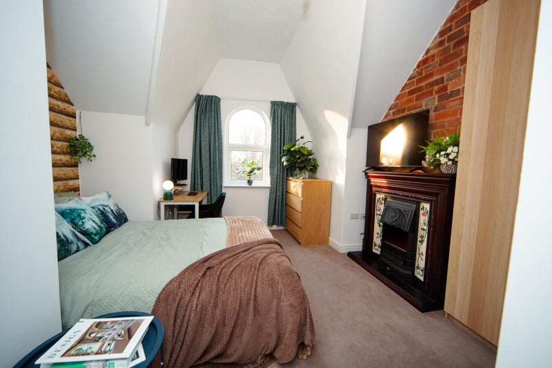 Large, bright loft-style room with character (feature fireplace & high ceilings)