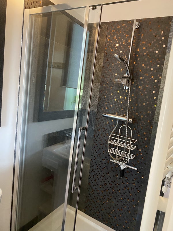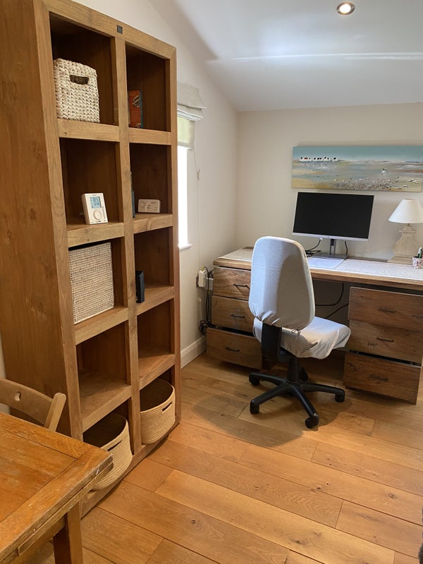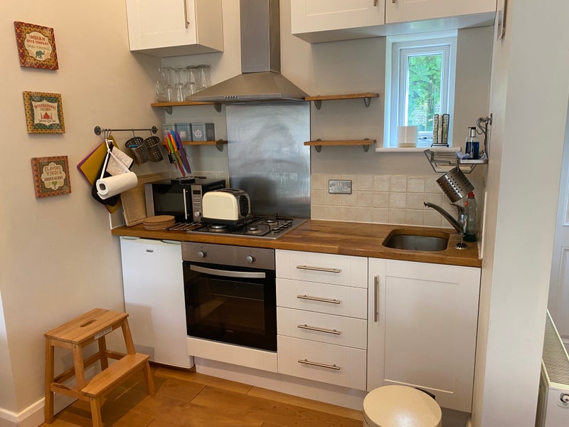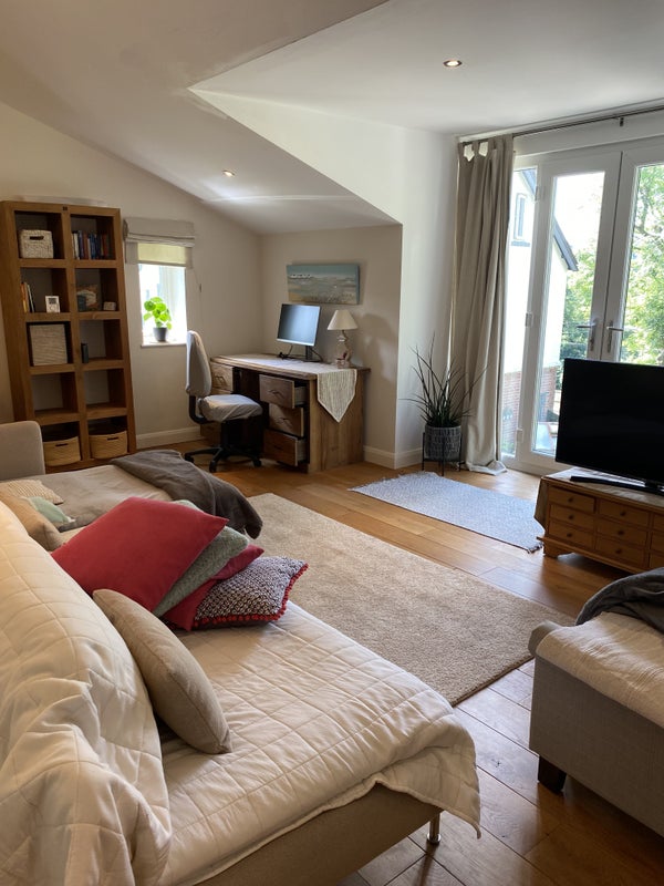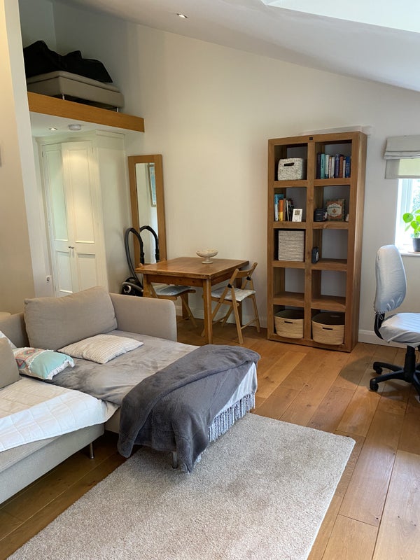 33m2 studio, own entrance above a double garage. Has kitenette area, double bed, sofa and en-suite with toilet, wash hand basin and shower. , There is use of shared garden and washing machine.