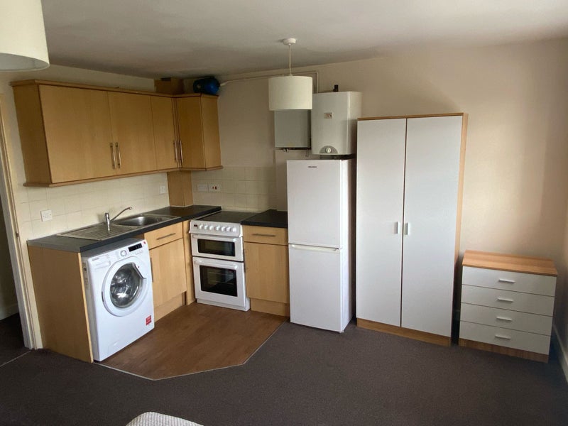 This fully furnished flat includes bed, mattress, bedside table, chest of drawers, wardrobe and light fittings.