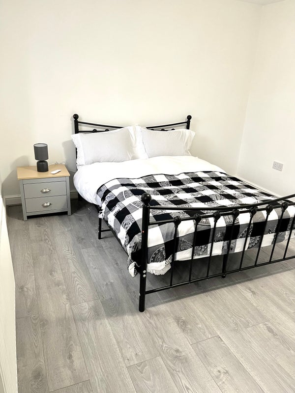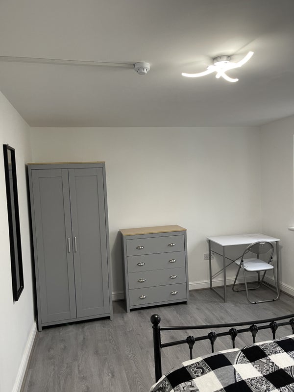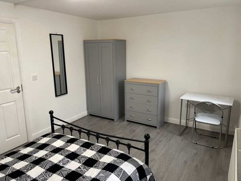 The double room includes a matching grey and oak wardrobe, chest of drawers and bedside table. A bedside lamp and double bed with good quality mattress are also provided. A desk and a chair - all brand new in 2023