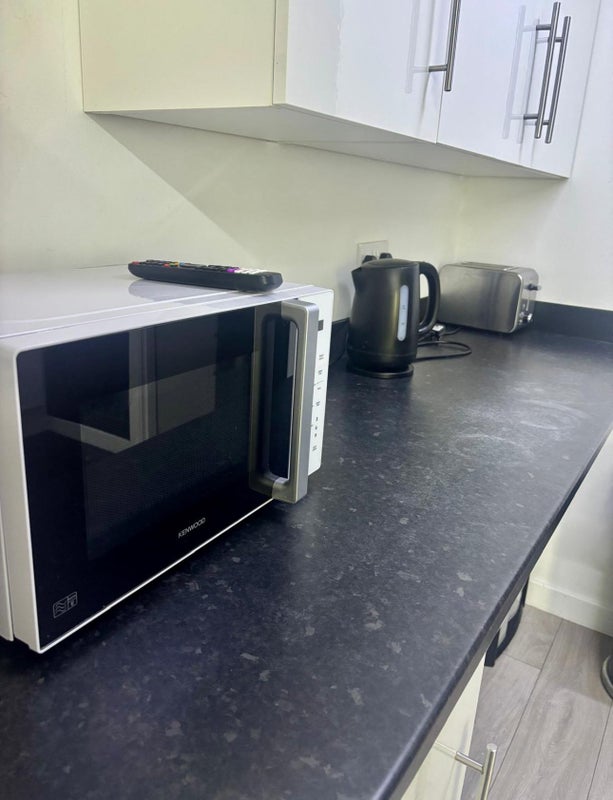 The fully fitted kitchen has a large worktop and is equipped with a Fridge/Freezer, Microwave, toaster, Oven, Kettle, Ironing board/ Iron and Hoover.