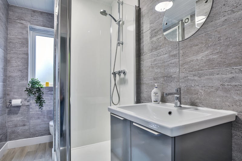 Bathroom - Fully tiled modern bathroom with new shower cubicle and new flooring. It has a toilet and extra-large vanity sink with a heated towel rail.