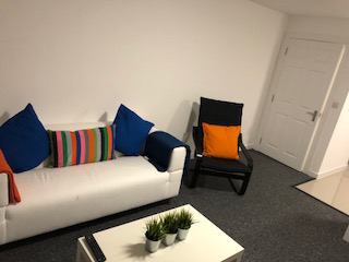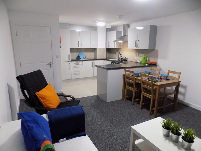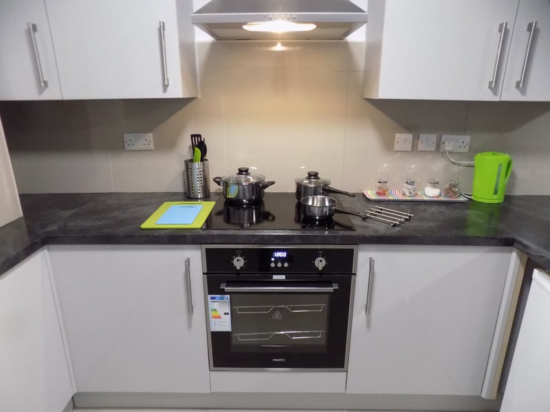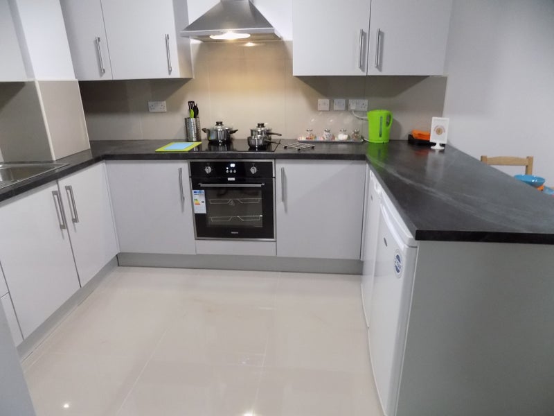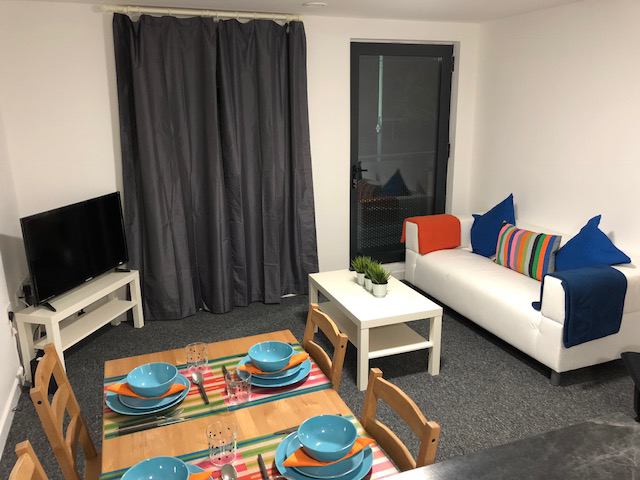 Open plan living is at the heart of this apartment – beautiful kitchen with plenty of cupboard space Cooker – Fridge Freezer and Microwave. Lounge area is complete with a Smart TV, comfy sofas and there is even space for dining. Flat consists of 5 ensuite rooms