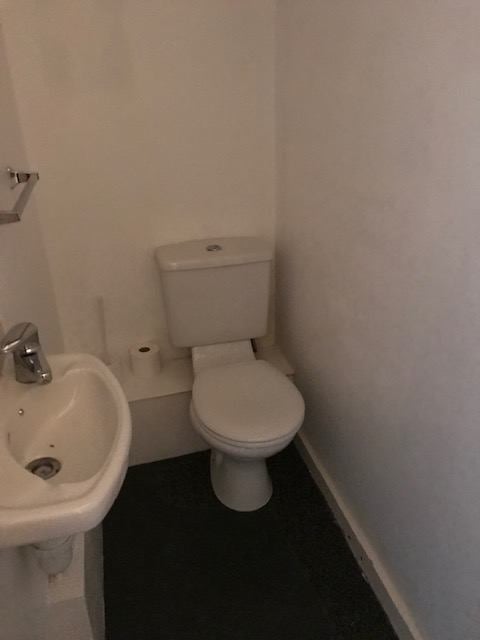 The hallway takes you to a spacious bathroom, featuring the shower unit, a toilet, and a sink. There is also a separate toilet room adjacent to the bathroom.