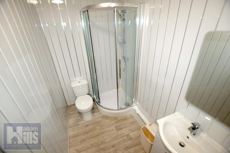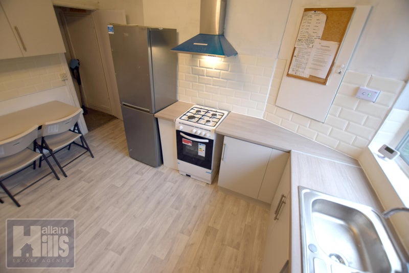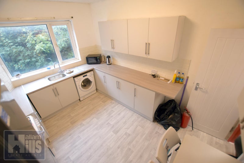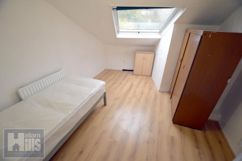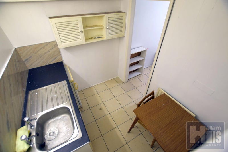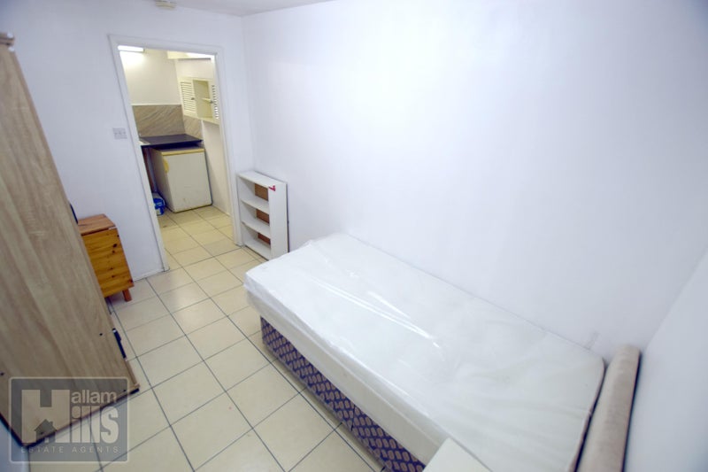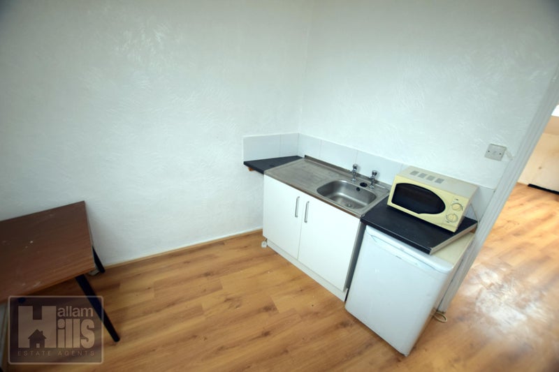 Bedroom 1 - Single bedroom with own kitchenette and ensuite bathroom. Single bed, desk, chair and shelf. Kitchenette includes sink, cupboards, fridge, microwave and kettle.