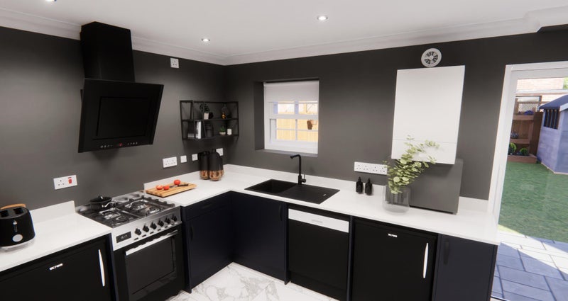A modern dining-kitchen with induction hob, oven, dishwasher, fridge-freezer, bean coffee machine, toaster, juicer-blender, air fryer, slow-cooker and doors leading to garden.