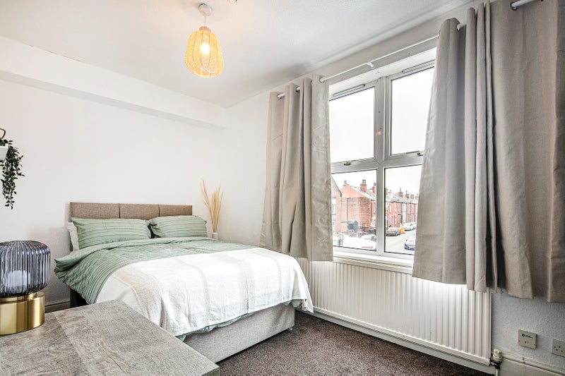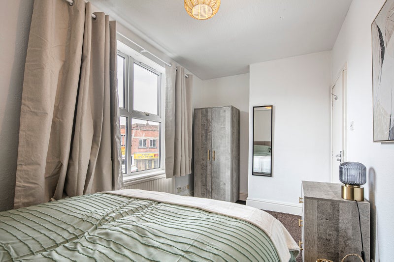 Room 1 Spacious double bedroom situated on the 1st floor, at the front of the house. Consists of double bed with cut out under bed storage space, matching fabric headboard, ortho double mattress, wardrobe, chest of drawers, bedside unit and bedside lamp. Double glazed windows with blackout blind and blackout curtains.