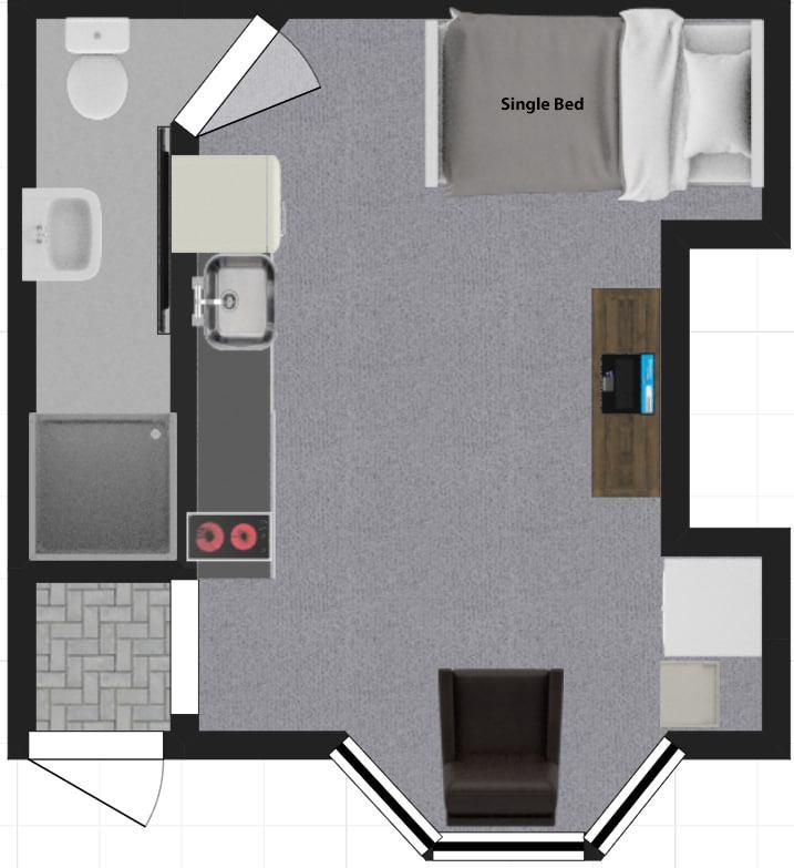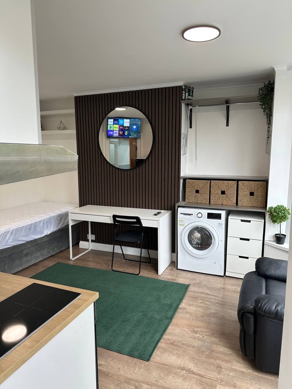 Modern living area, single ottoman bed (under storage) (brand new mattress), storage, desk and chair (Will upgrade chair if wanted), new modern kitchen with toaster, kettle, microwave, 2 ring induction hob, full-sized oven and fridge freezer.