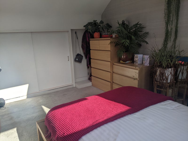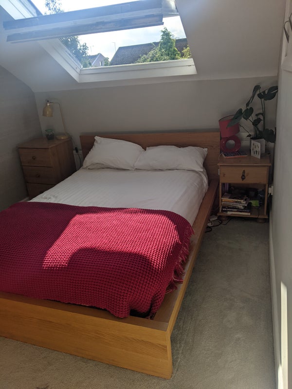 The attic bedroom is quiet, overlooks garden, airy, bright with loads of storage. The bed is a European double (slightly larger than UK double).
