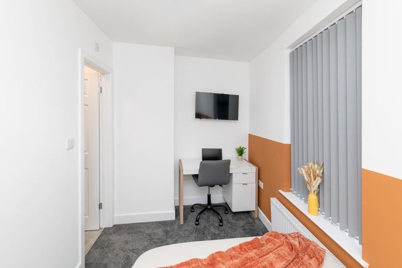All bedrooms consist of a double mattress/bed with a stylish high fabric headboard, wardrobe with drawers, bedside unit, work desk with chair, smart tv and full private ensuite with shower, sink and WC.