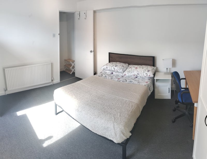 Fully furnished with double bed, wardrobe, chest of drawers, desk and chair, bedside table, bookshelf, shoe rack and lockable door.