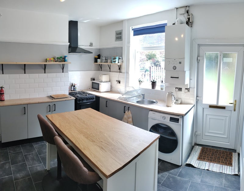 Gas hob and oven, fridge-freezer, washing machine, tumble dryer and clothes line, microwave, kettle & toaster, and a seated kitchen island.