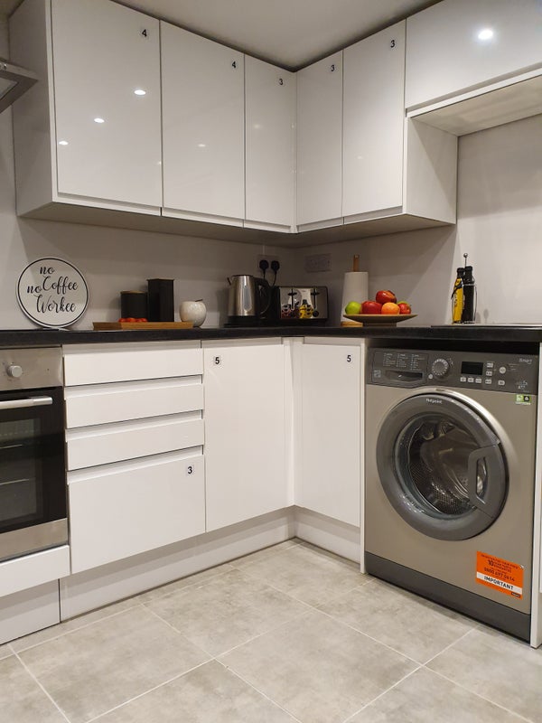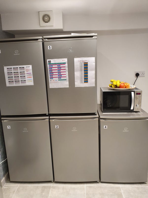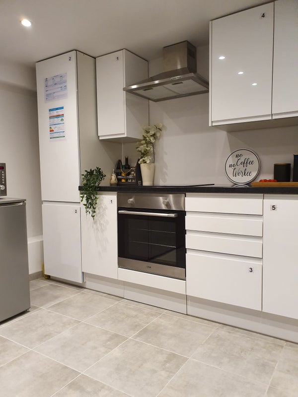 • Modern shared kitchen equipped with 2 fridge freezers, oven, microwave, kettle & toaster