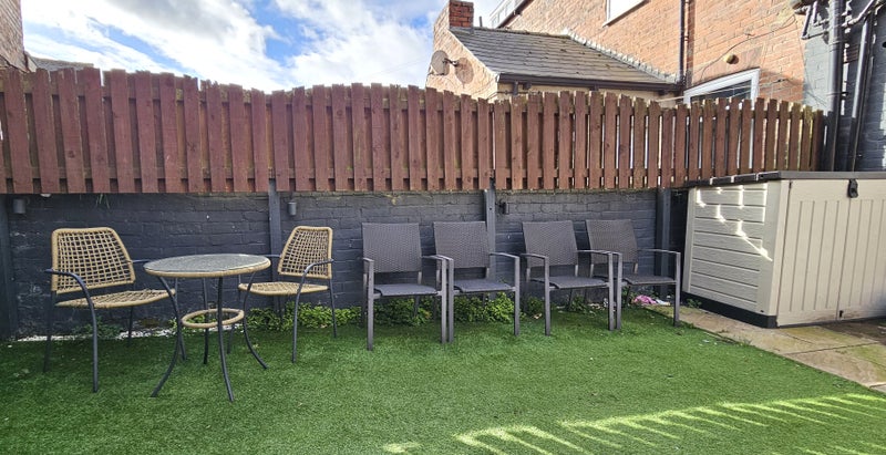The property benefits from a private, secure gated outdoor space with low-maintenance astro-turf and outdoor seating. This area is ideal for relaxing or secure bicycle storage.