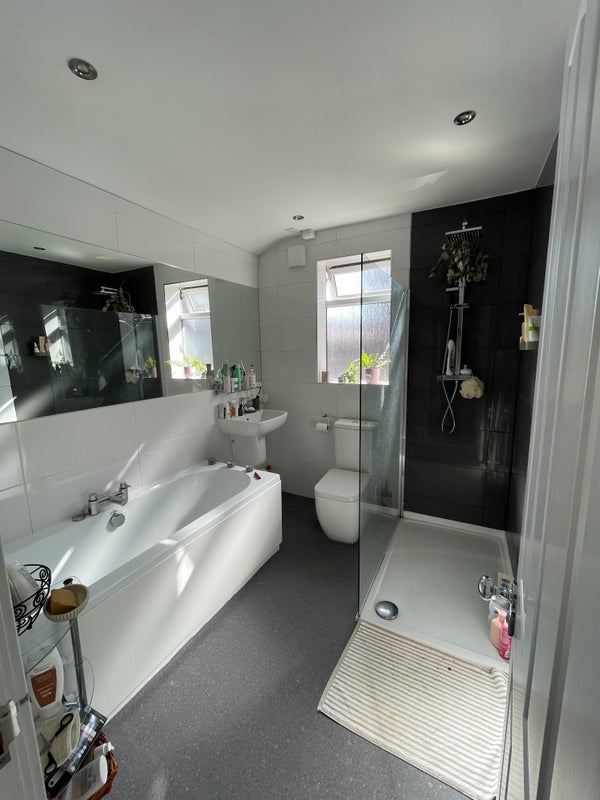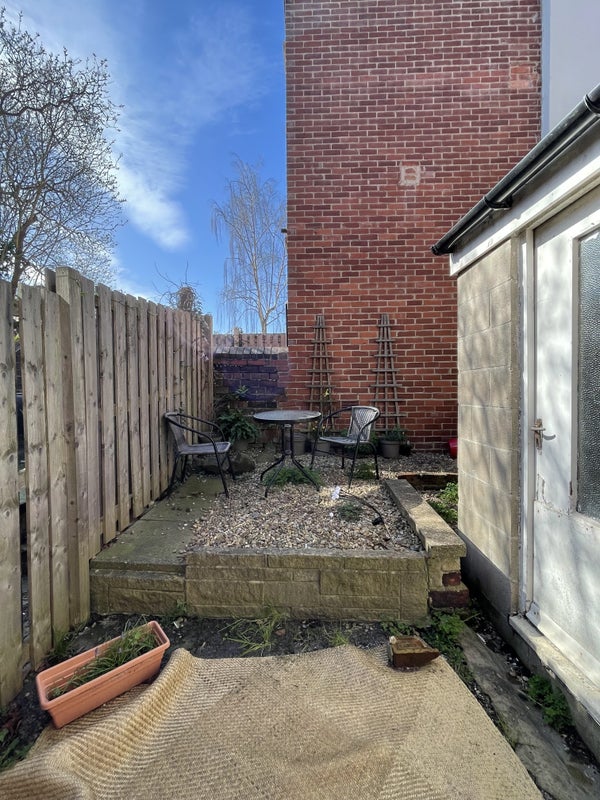 On the bottom floor the house has a spacious living room with a large TV and separate dining room with wooden furnishings. It has a small kitchen and small garden area with a table and chairs but this works absolutely fine for two people. There is a large fridge/freezer with plenty of space. On the middle floor there is a large and light bathroom with a separate bath and shower, and there is one bedroom, as well as another room with a bed and a desk in which we currently use as a spare room/ my office space. On the top floor would be your room.