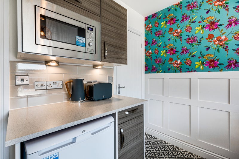 There is a kitchenette area with microwave , kettle and toaster, fridge with freezer compartment and space for cutlery and crockery.