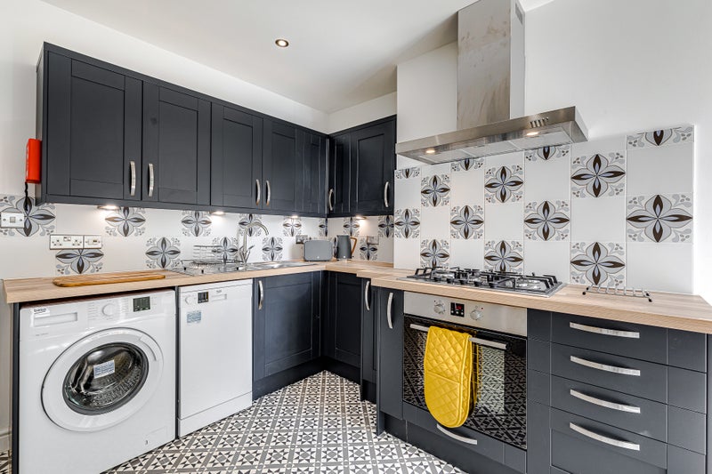 There is a breakfast bar, flat screen TV and double glazed door, leading to the garden. containing a shed for bikes and storage.