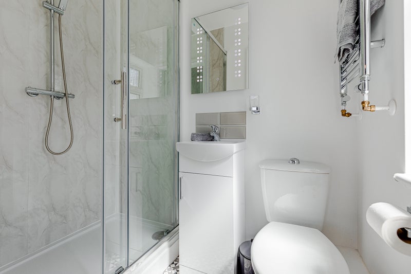 The en-suite contains shower cubicle with rainfall shower head, and secondary shower head.