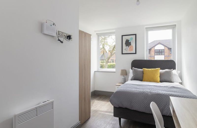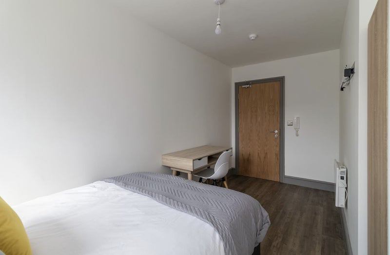 Wind down and enjoy a perfect night's sleep. Your bedroom comes with brand-new contemporary furnishings, featuring a double bed, wardrobe, bedside table, desk and chair.