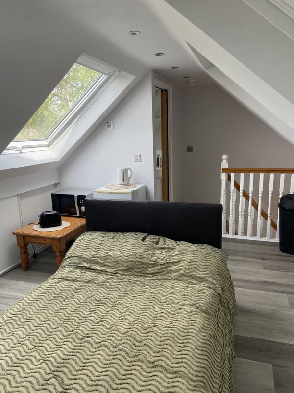 I am looking for a professional person who needs a flat but is able to shower elsewhere - perhaps at a gym they are a member of, or at their place of work? The flat is situated in a very quiet cul de sac with countryside views. There is also table and chairs next to a pond in the front garden you are welcome to make use of.