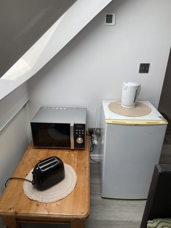 The flat consists of a fully furnished bedroom and en-suite. Included in price is: three quarter bed, TV and DVD player, under floor heating, WI-Fi, large fridge, microwave, kitchenware, toaster, clothes hanger, and absolutely loads of storage cupboards running down both sides of the room. En-suite has toilet and basin with hot water. There is plenty of room for off road parking in front and at the side of the garage.