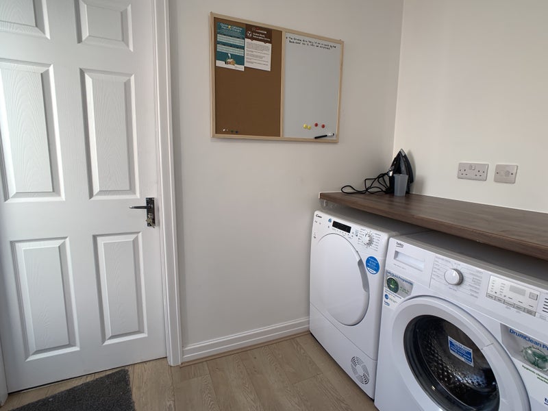 There is a washing machine and tumble dryer contained within a separate utility space.