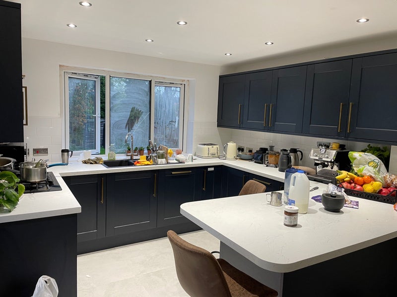Large brand new kitchen and Smart TV in living area.