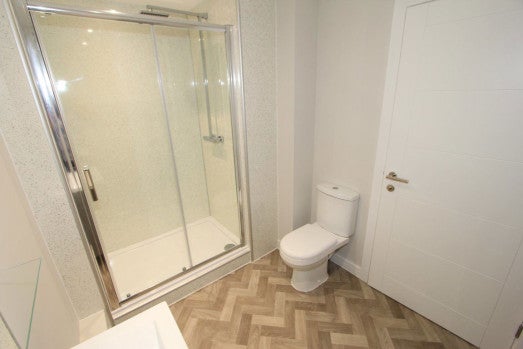 Shower Room - 6ft 4in x 6ft 4in (1.95m x 1.59m).Wood effect vinyl flooring fitted. White décor. Double shower enclosure with glass sliding door and shower board to walls. White ceramic wash hand basin with mixer tap inset to a grey vanity unit. White ceramic WC
